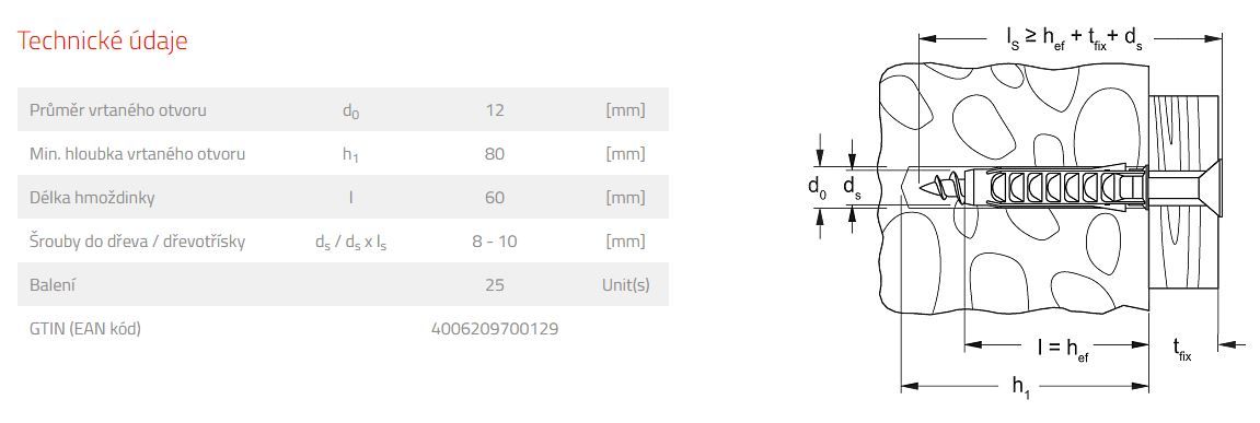 Fischer rozpěrná hmoždinka SX 12 x 60 s límečkem.