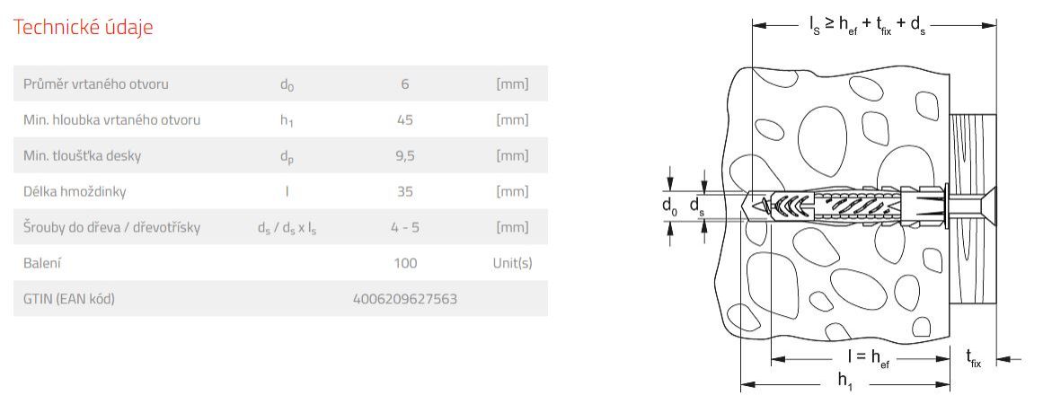 Univerzální nylonová hmoždinka s límečkem do všech stavebních materiálů.