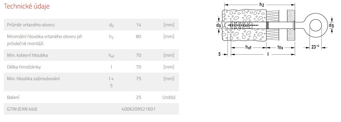 Fischer hmoždinka S 14 ROE je rozpěrná kotva z kvalitního nylonu pro fischer závitové oko GS 12. Křidélka po stranách zabraňují protočení hmoždinky a usnadňují montáž. Při šroubování závit rozpíná hmoždinku dvěma směry a bezpečně ji zapře proti stěně vyvrtaného otvoru. Při montáži blízko k okraji natočte hmoždinku tak, aby směr rozpínání vedl podél okraje.