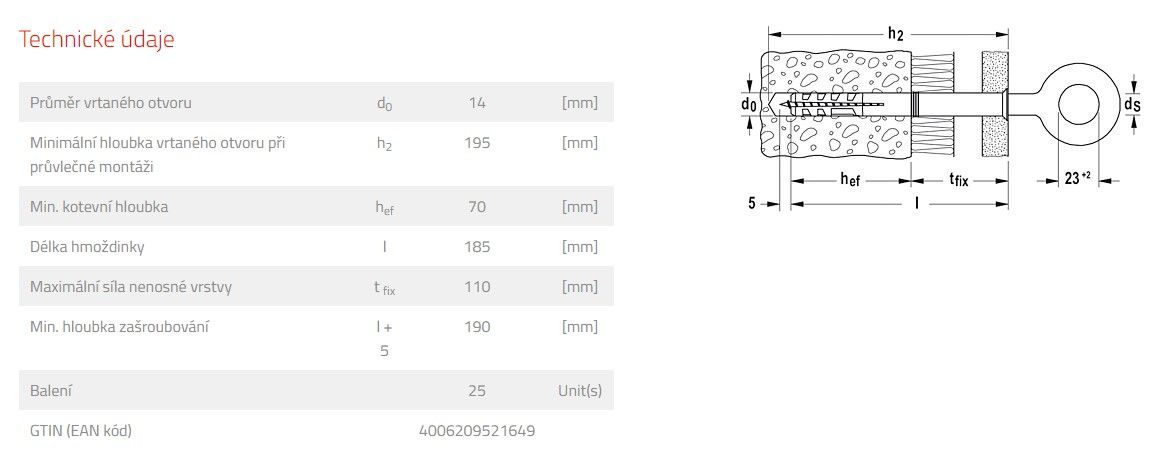 Fischer hmoždinka S 14 ROE 185 - rámová hmoždinka do plných materiálů rozpínající se do 2 stran pro fischer kotvu s okem GS 12.