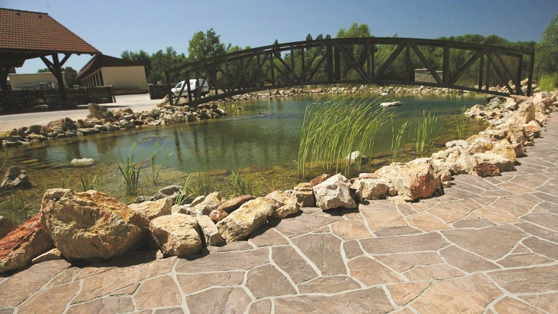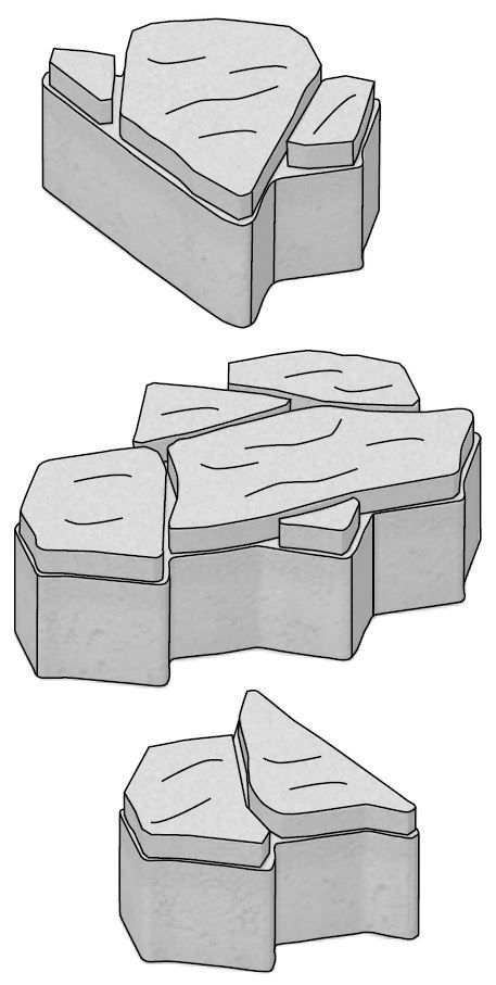 Dlažba připomíná svým vzhledem mozaikovou skladbu plochých lomových kamenů, ve skutečnosti se jedná o skladbu sedmi kamenů.