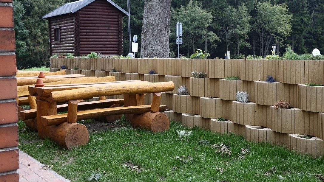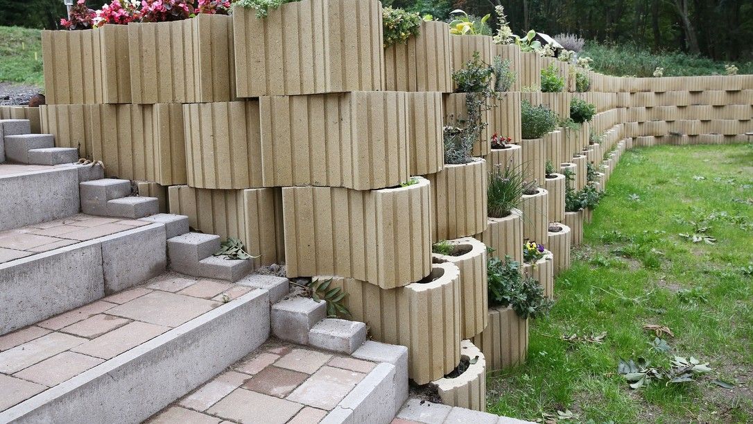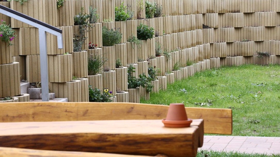 • Opěrná zeď vytvořená z květináčů oproti standardní opěrné zdi z tvarovek přidanou hodnotu v podobě možnosti osazení okrasnými květinami.