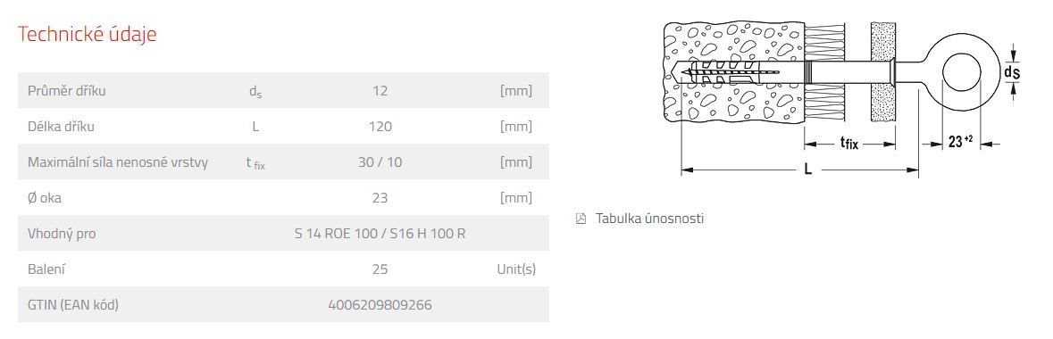 Fischer oko se závitem GS z galvanicky zinkované oceli se kombinuje s rozpěrnou hmoždinkou S 14 ROE vhodnou do plných stavebních materiálů. S hmoždinkou S 16 H se oko se závitem používá do zdiva z děrovaných cihel nebo pórobetonu. Značení na těle šroubu umožňuje kontrolu hloubky zašroubování a zabraňuje nechtěnému uvolnění. fischer oko se závitem je vhodné pro upevnění fasádního lešení, kabelů či řetězů.