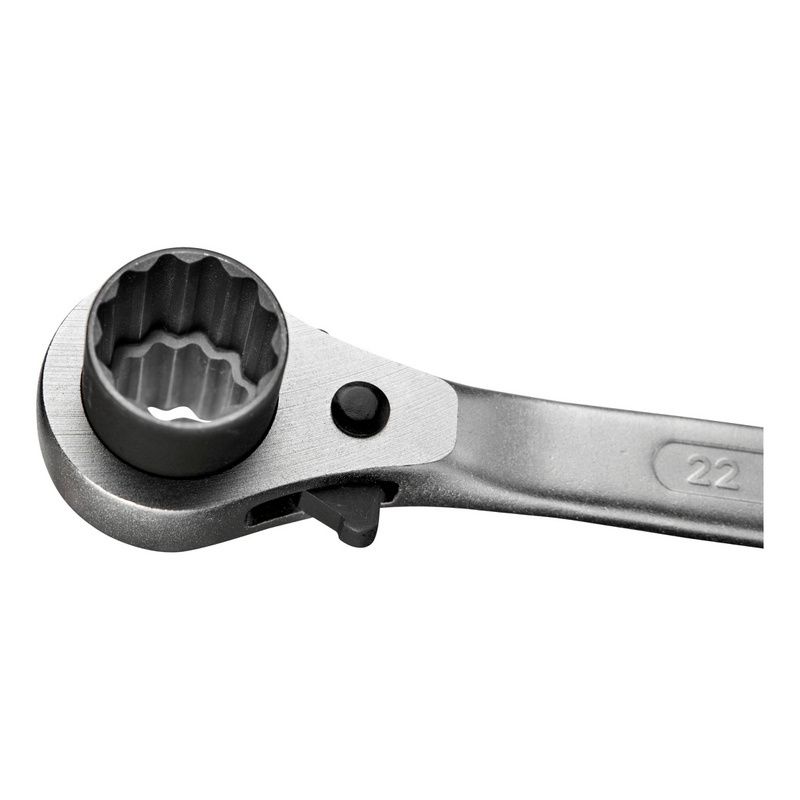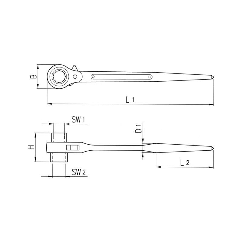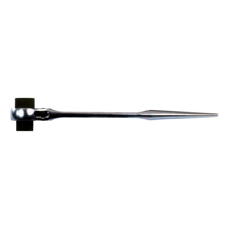 Přepínání mezi pravým a levým chodem. Špičatý kónický kolík na hrotu ráčny - pro zarovnávání otvorů lešení.