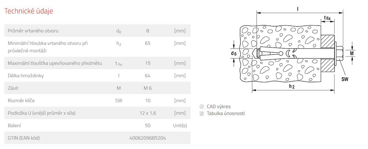 Detailní informace k výrobku, postupy, hodnoty atd. jsou uvedeny v technickém listu na https://www.fischer-cz.cz/cs-cz