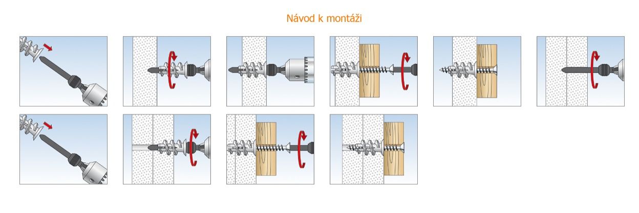 Při osazování do roviny s povrchem sádrokartonu se použije přiložený montážní přípravek upnutý do aku šroubováku. Před osazením hmoždinky do desky do tloušťky 15 mm není nutné předvrtávat otvor. Hmoždinkou fischer GK lze bezpečně upevnit dřevěné lišty, kovové plechy apod. pomocí šroubu do dřevotřísky pr. 4 - 5 mm nebo obrázky, svítidla a elektroinstalace pomocí skob, háků či ok.
