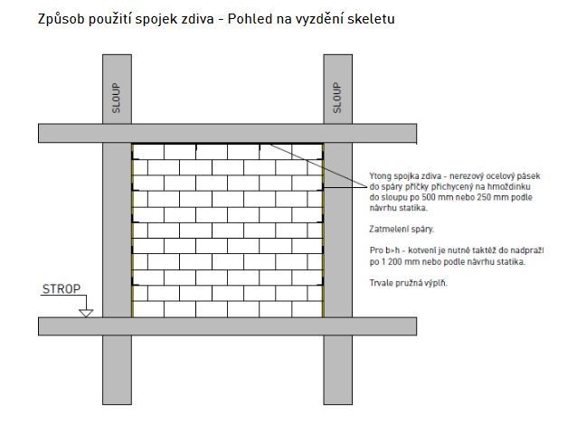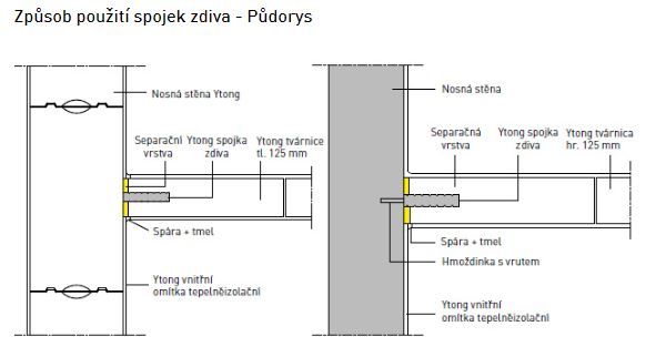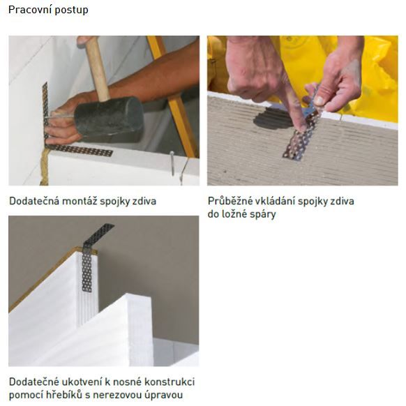 V praxi se používá přichycení příčky spojkou v každé druhé nebo třetí ložné spáře.