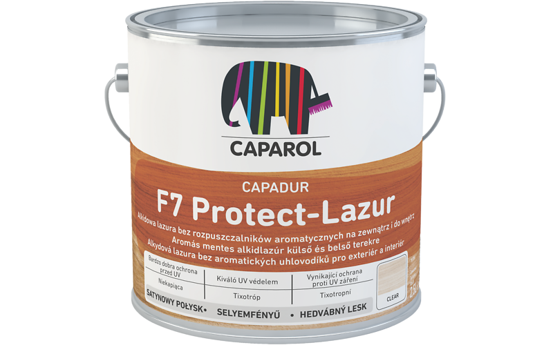 Lazurovací barvu F7 Protect-Lasur „bezbarvou" používejte ve vnějších prostorech jen jako základní nátěr pod barevnou lazuru nebo jako krycí nátěr na lazuru tmavé barvy, protože jinak nebude zaručena dostatečná ochrana proti UV záření. Na vnějších plochách, volně vystavených působení povětrnostních vlivů, bezbarvou lazuru nepoužívejte.