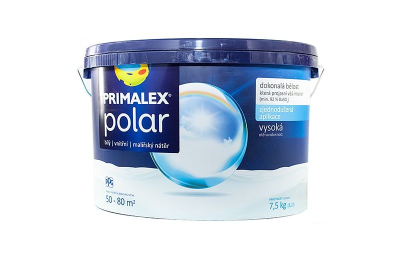 Primalex POLAR Bílý nabízí dokonalou bělost, která projasní váš interiér. Díky pečlivému výběru nejkvalitnějších kalcinovaných vápenců a vysokému podílu titanové běloby můžeme garantovat nejvyšší stupeň „polární“ bělosti (min. 92% BaSO4).