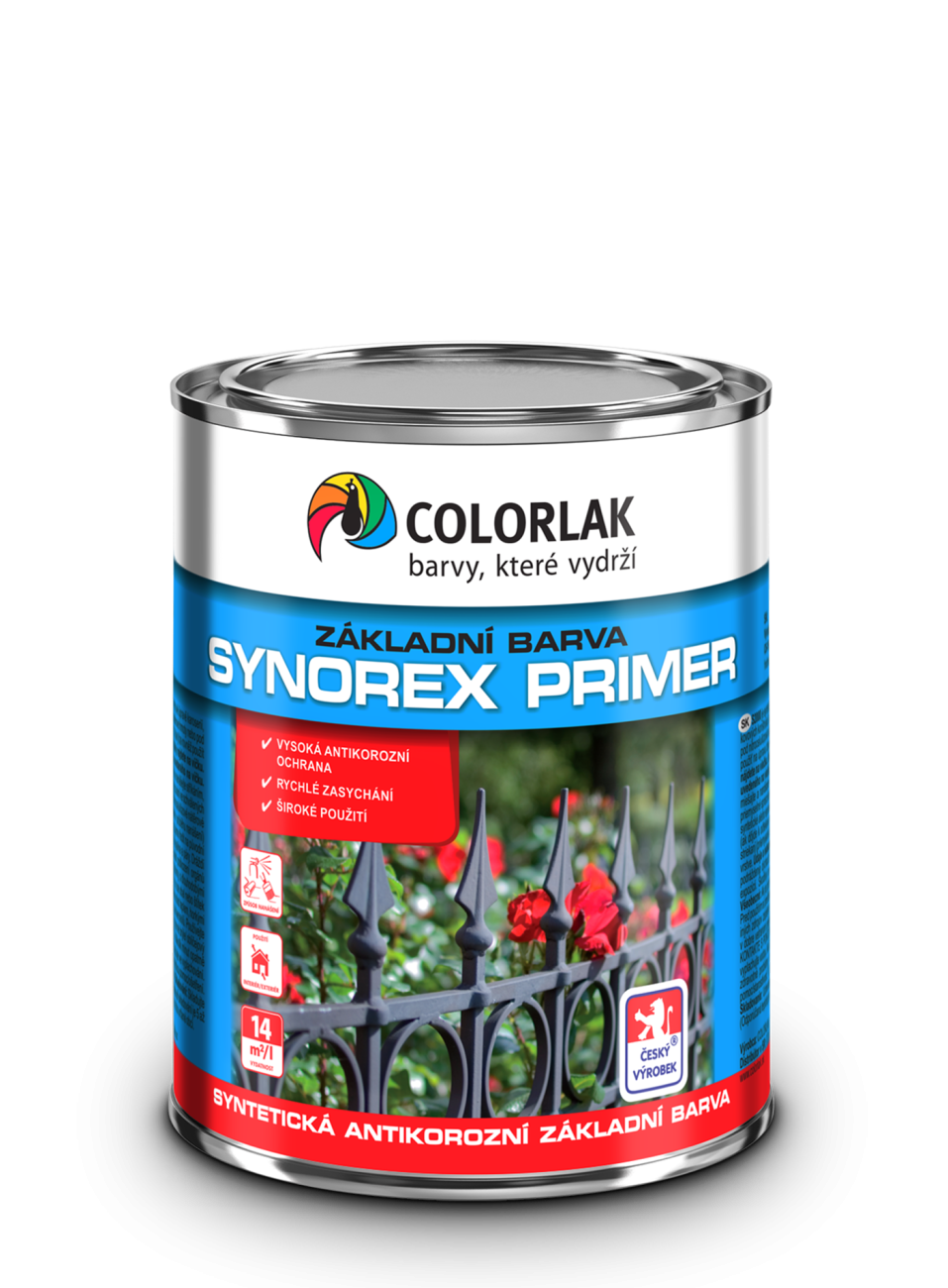 • SYNOREX je základní barva s vysokou antikorozní ochranou na železné kovy a litiny pro venkovní i vnitřní použití. Je vhodná pod syntetické a epoxidové nátěrové hmoty (nejméně po 24 hod.) např. k povrchové úpravě kovových konstrukcí, vrat, plotů apod.