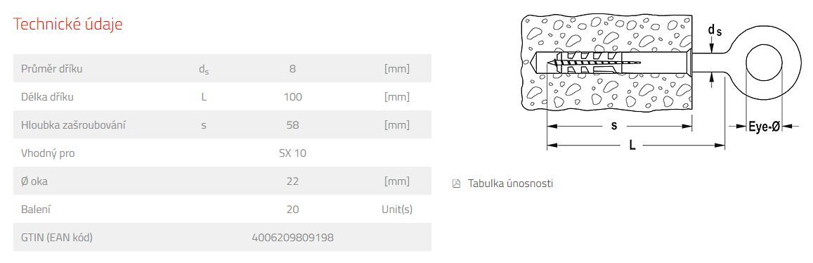 S rozpěrnou hmoždinkou SX 10 je oko GS 8 vhodné k upevnění např. lanek, řetízků, prádelních šňůr nebo třeba zavěšených truhlíků a květináčů do betonu a na plné zdivo.