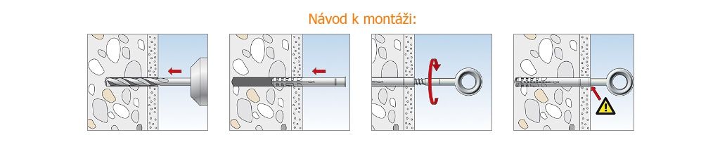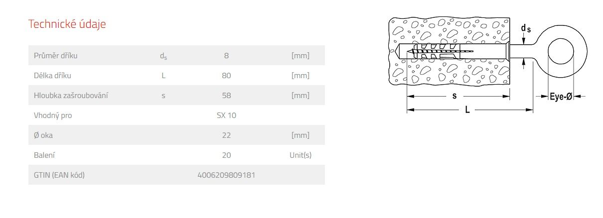 S rozpěrnou hmoždinkou SX 10 je oko GS 8 vhodné k upevnění např. lanek, řetízků, prádelních šňůr nebo třeba zavěšených truhlíků a květináčů do betonu a na plné zdivo.