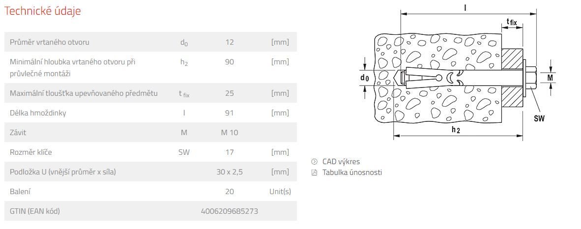Fischer Plášťová kotva FSA 12/10 x 75 mm S M10 (balení 20 ks)