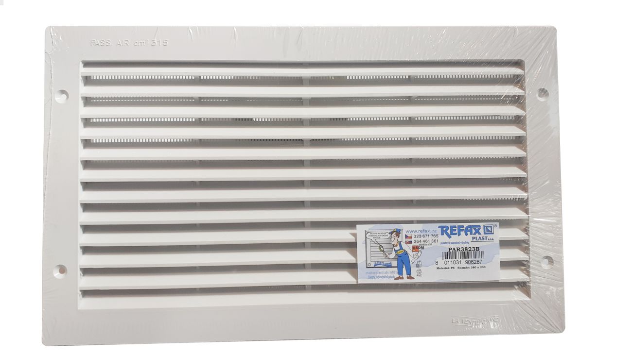 Mřížka ventilační PVC hranatá bílá 380 x 230 mm.
