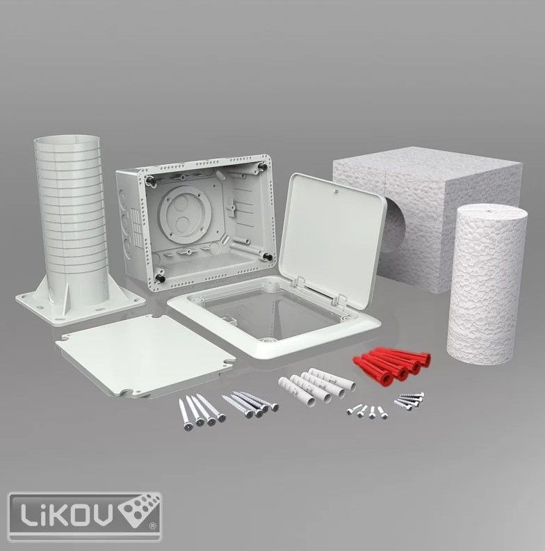 sestava obsahuje krabici, tubus, vnější a vnitřní izolaci, montážní příbal, otevírací víko VO 180, montážní desku a nerezové šrouby
