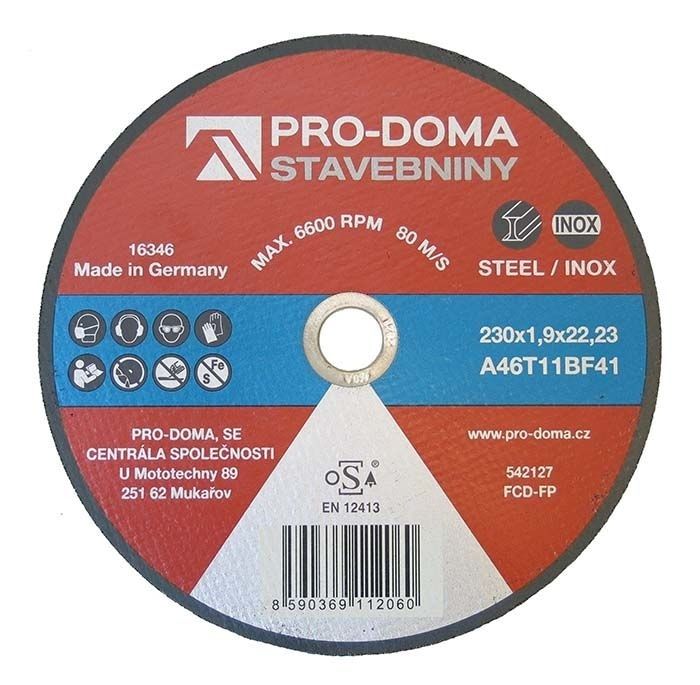 Kvalitní řezný kotouč PRO-DOMA je určený k řezání běžné i nerezové oceli.