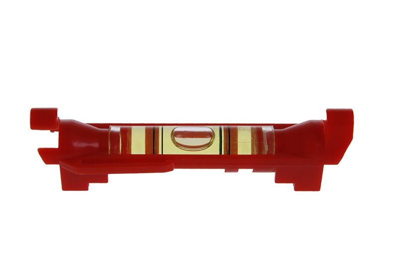 Malá plastová vodováha se dvěma háčky pro zavěšení na provázek, zvlášť lehké provedení, aby se zabránilo prověšení.